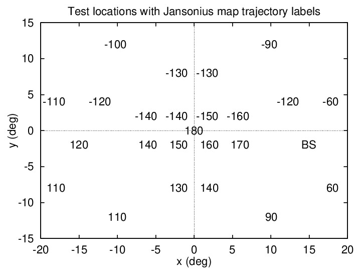 - on average one test location per 10-degree trajectory on the Jansonius map temporal to the optic disc, with no gaps exceeding 20 deg; limited sampling nasal to the optic disc (one test location per quadrant) to ensure a reasonable total test time