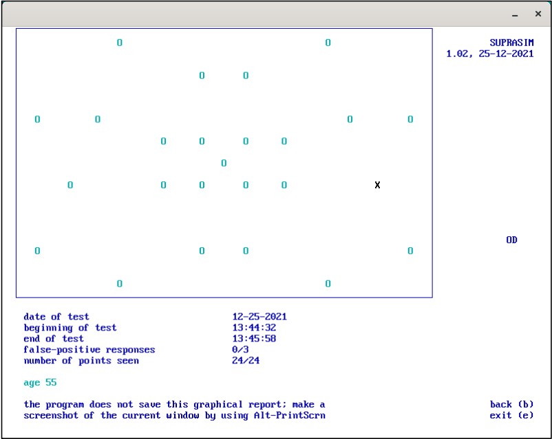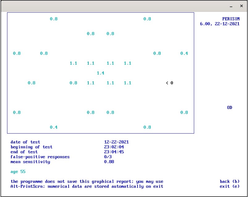 Note: the inevitably limited dynamic range of PERISIM allows for a proper determination of the healthy (including normal ageing) hill of vision; abnormal areas of the visual field are detected, but reported as not seen rather than being fully characterized.